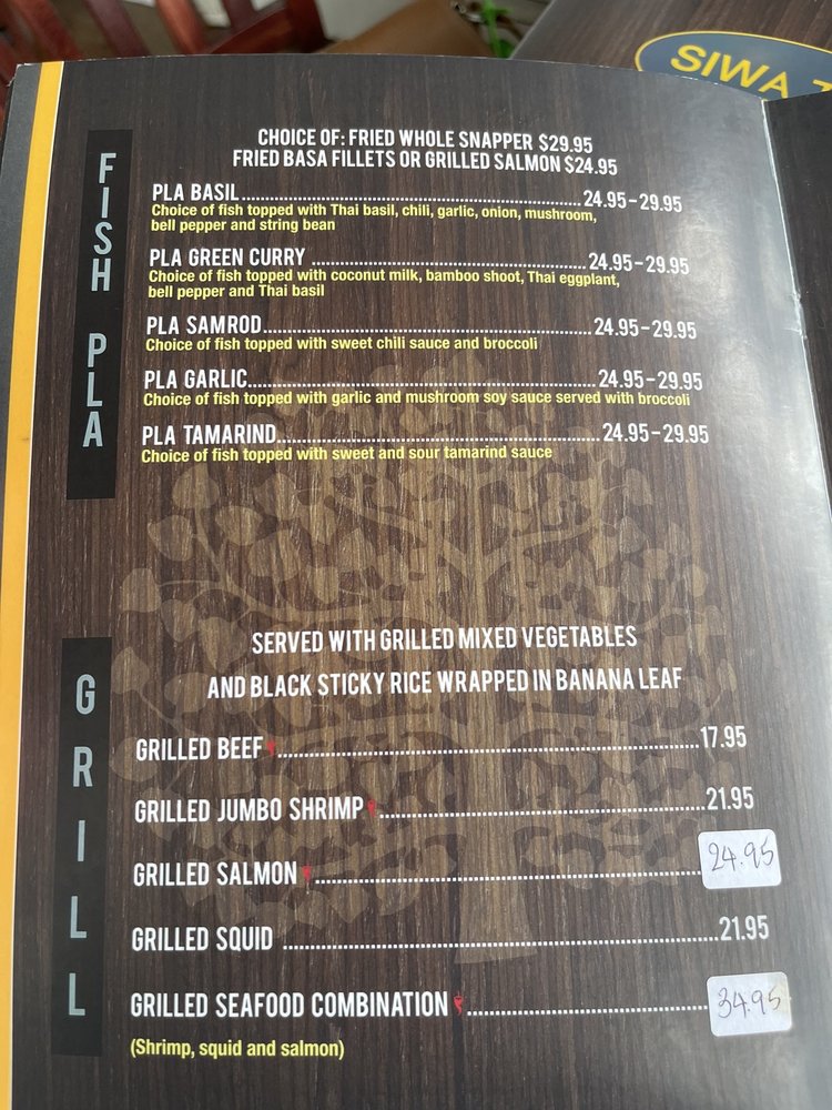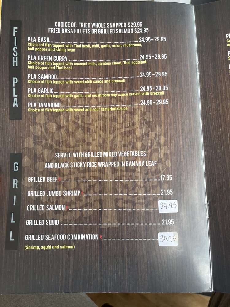 Choice of fish, topped with coconut milk, bamboo shoot, Thai eggplant, bell pepper and Thai basil.
