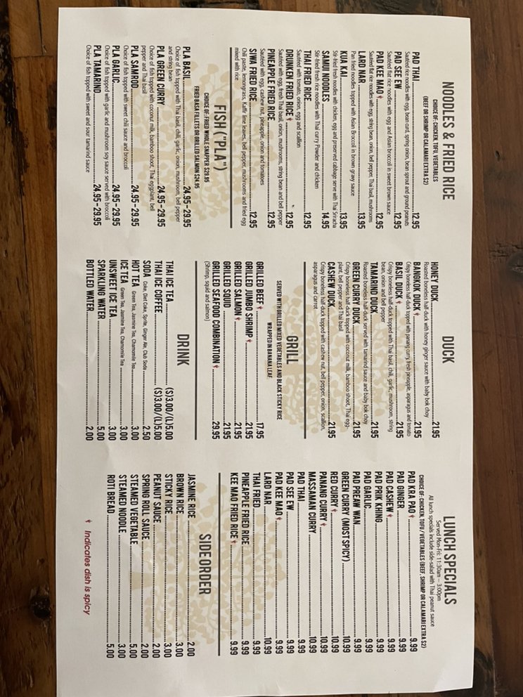 Crispy boneless half-duck topped with coconut milk, bamboo shoot, Thai eggplant, bell pepper and Thai basil.