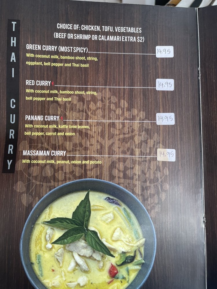 Most Spicy. With coconut milk, bamboo shoot, string, eggplant, bell pepper and Thai basil.